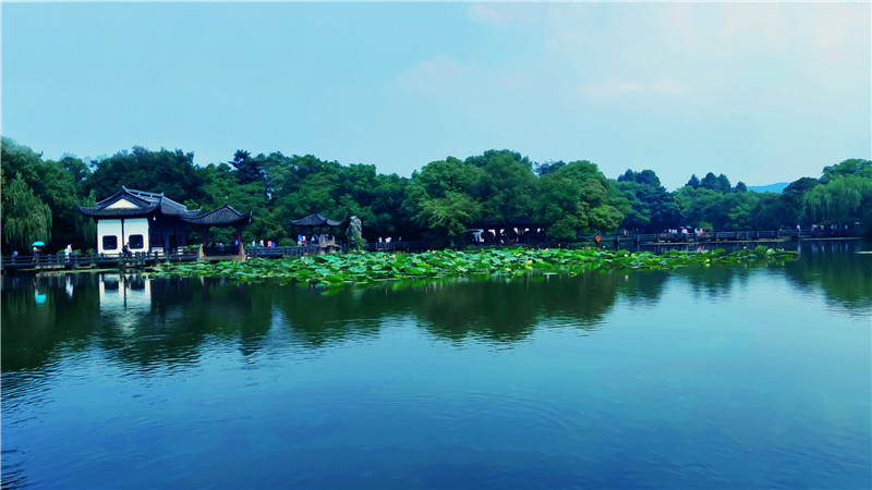 杭州夏季西湖被绿色植物环绕镜头